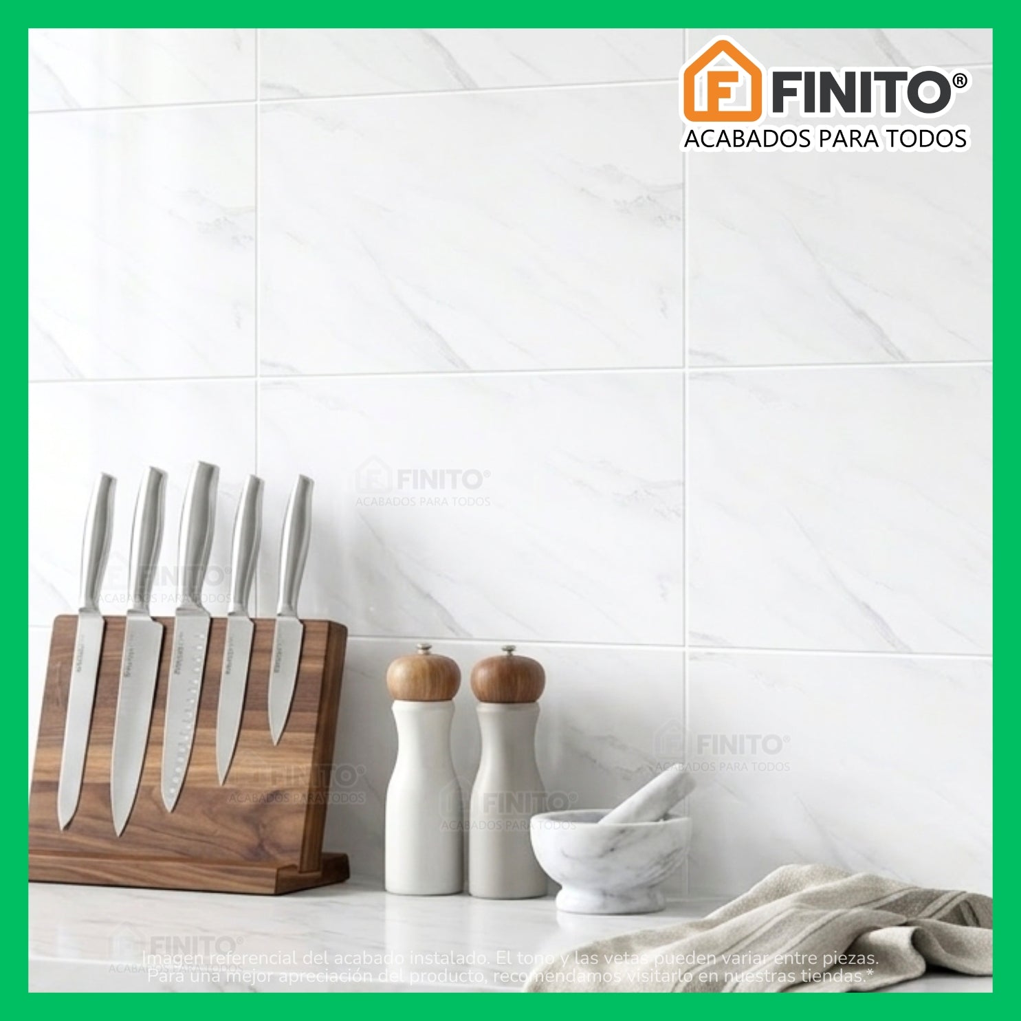- Uso recomendado: Paredes interiores (cocinas, baños y muros decorativos)